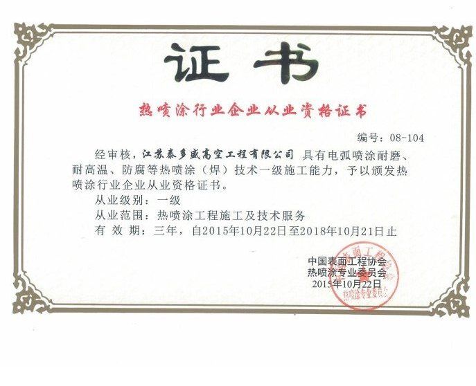 熱噴涂行業(yè)企業(yè)從業(yè)資格證書